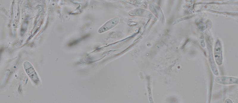 Spores are navicular with a large central nucleus, a pair of medium-sized LBs between the nucleus and the tip, and some more small ones, 1 septum in overmature state, (10,1) 12.3 - 15.7 (17.2) × (3,3) 3.7 - 4.4 (4.6) µm; Q = (2,4) 3.1 - 4 (4.6); N = 54; Me = 13.7 × 4 µm; Qe = 3.4 in living state.
