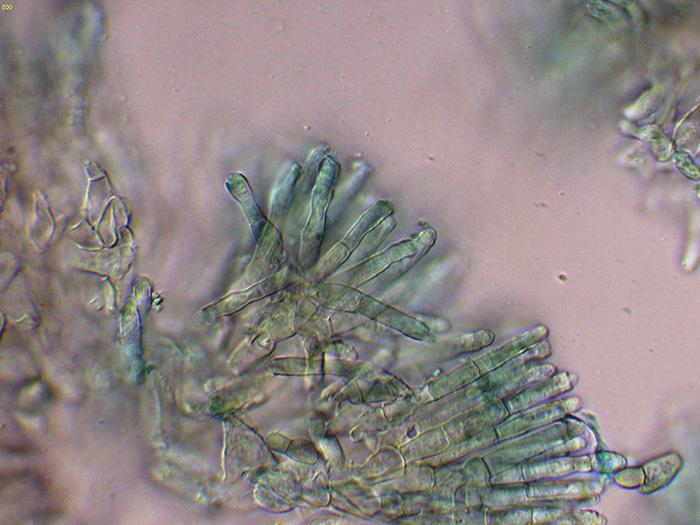 Conidiogenous hyphae arranged vertically and parallel, in a palisade, with two to three septa, cyanophilous and with measurements of (26.3) 31.7 - 43.3 (43.9) × (3.5) 3.6 - 5 (5.2) µm.