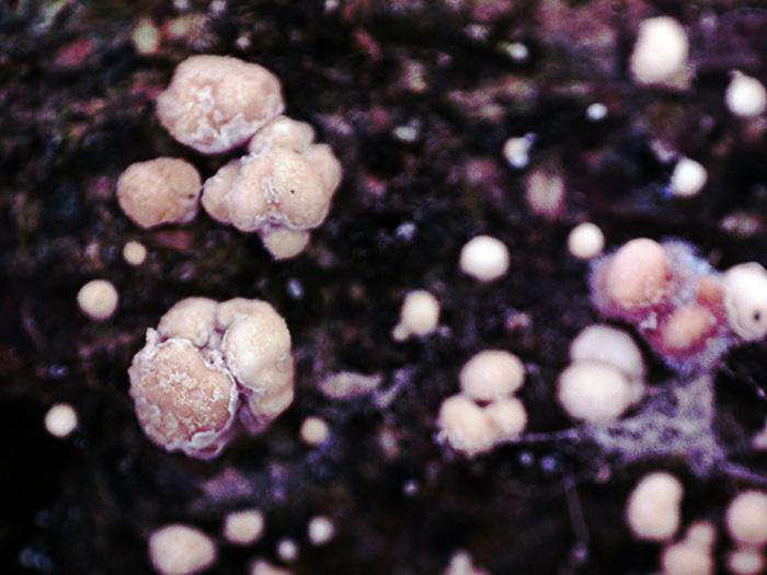 Some cream-colored grain-like fruitings, some of them grouped together with a diameter of between 0.3 and 1.25 mm, sprouting on a small trunk from the ground under mangroves in the Laguna Bávaro Natural Space (Dominican Republic).