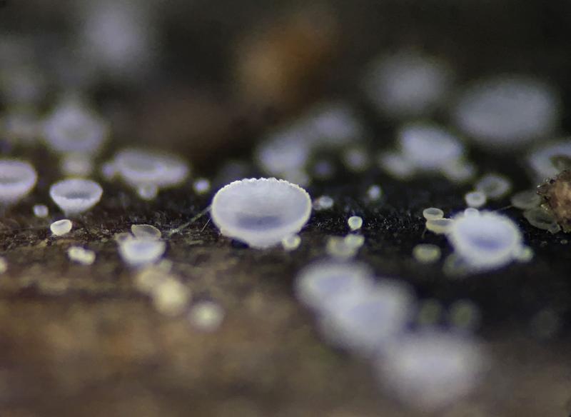 Apothecia are pale white/hyaline, up to about 1mm in diameter, with a crenulate margin.