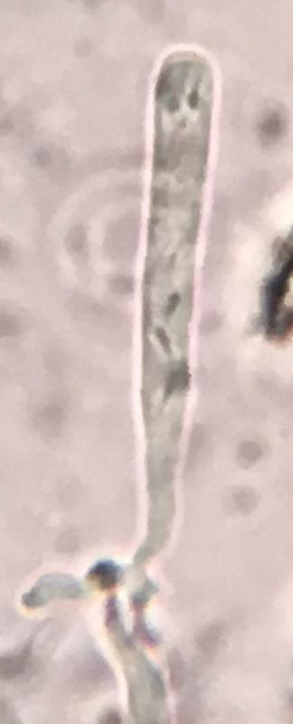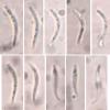 Spores are curved and occasionally S-shaped (in three dimensions) with guttules in many instances and with a spore body at the acute end in some instances. 8-10.5 x 0.8-1.1µm