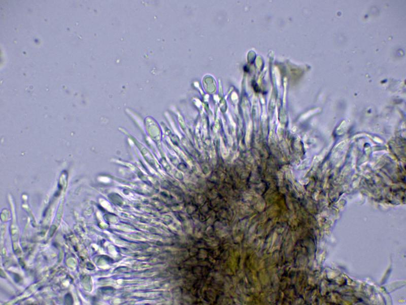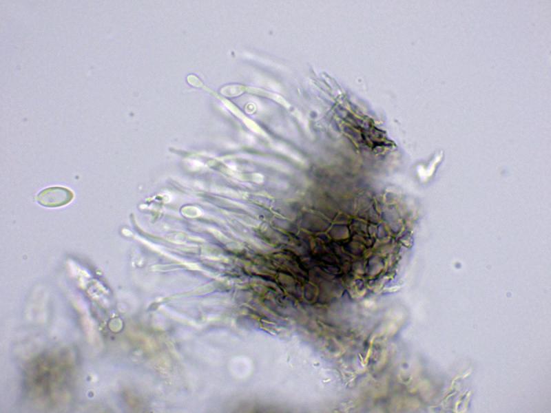 These conidiogenous hyphae produce ellipsoidal, hyaline conidia with one or two large lipid droplets inside. Free conidia with brown intracellular pigment were also observed, which could perhaps correspond to mature conidia.