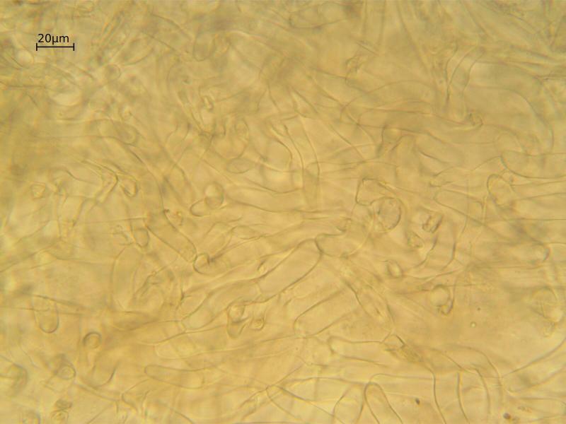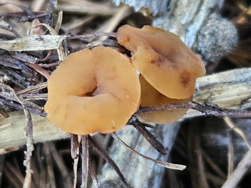 Apothécies brun ocracé avec un stipe très court, 4-9 mm de diamètre, ombiliquées, pas de poils.