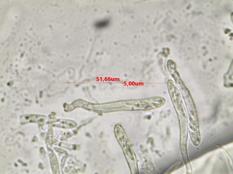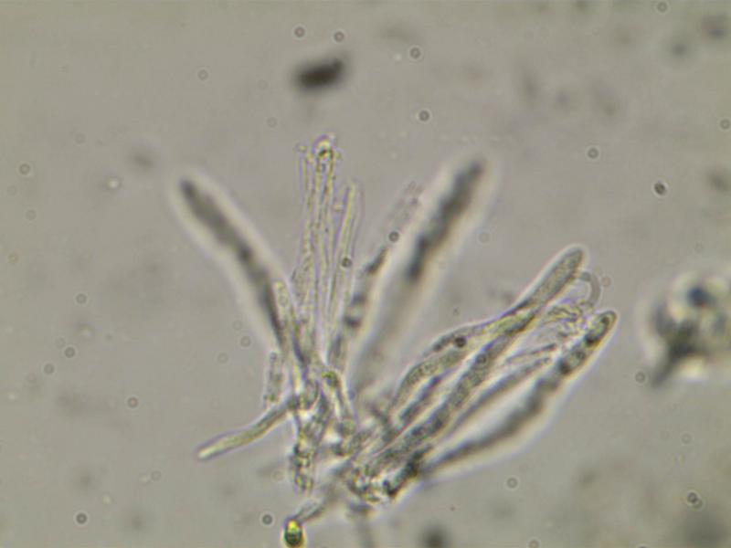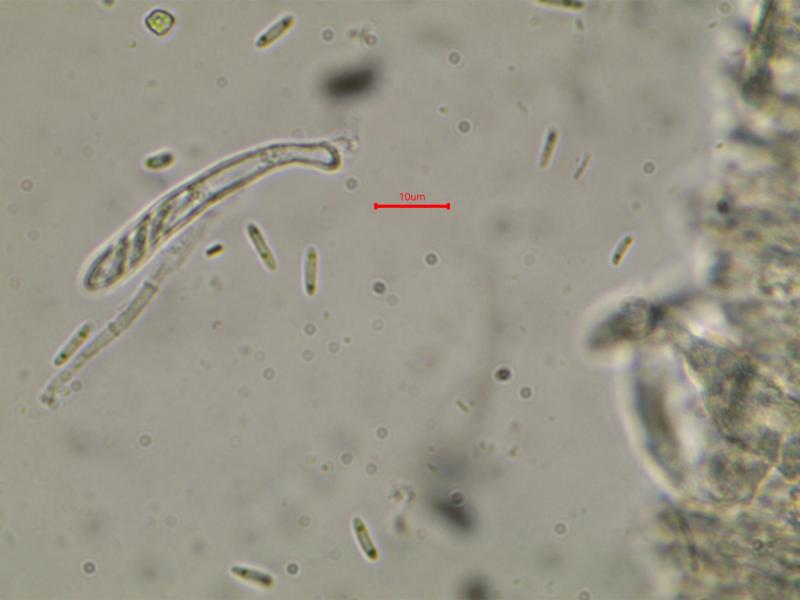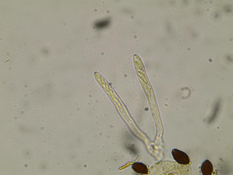 Asque à crochet, 40-50 X 5-6 µ, 8 spores bisériées, en apex en bleu sombre au lugol (pas évident),