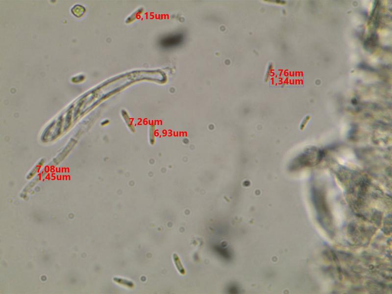 Spores cylindriques à sommet arrondi, 6,0-7,5 X 1,3 - 1,5 µ, lisses, 1 guttule à chaque extémité,