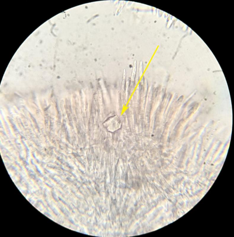 Did you notice any crystal in the hairs ? D. nivea , which is fairly common in Europe on the underface of hard logs, genrally shows such crystals.