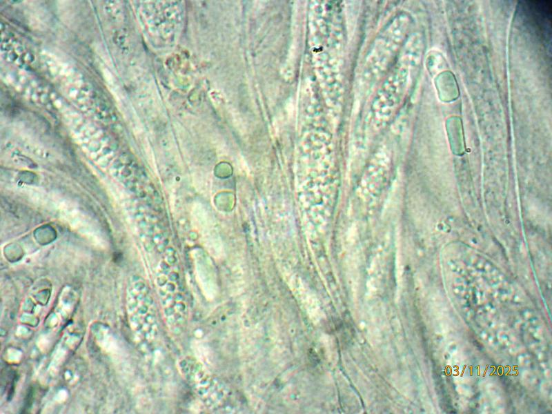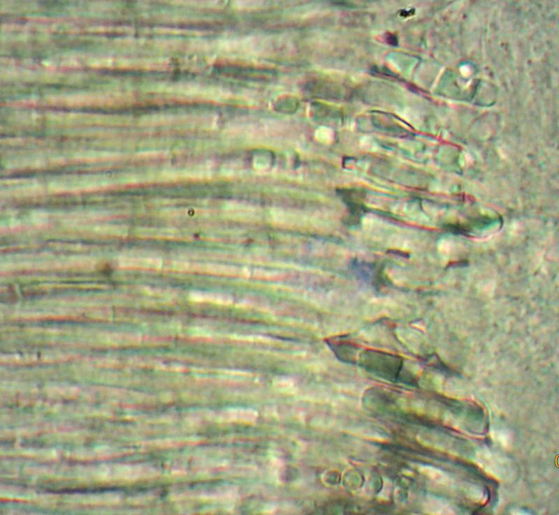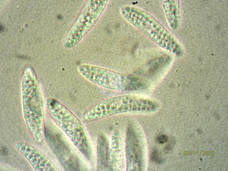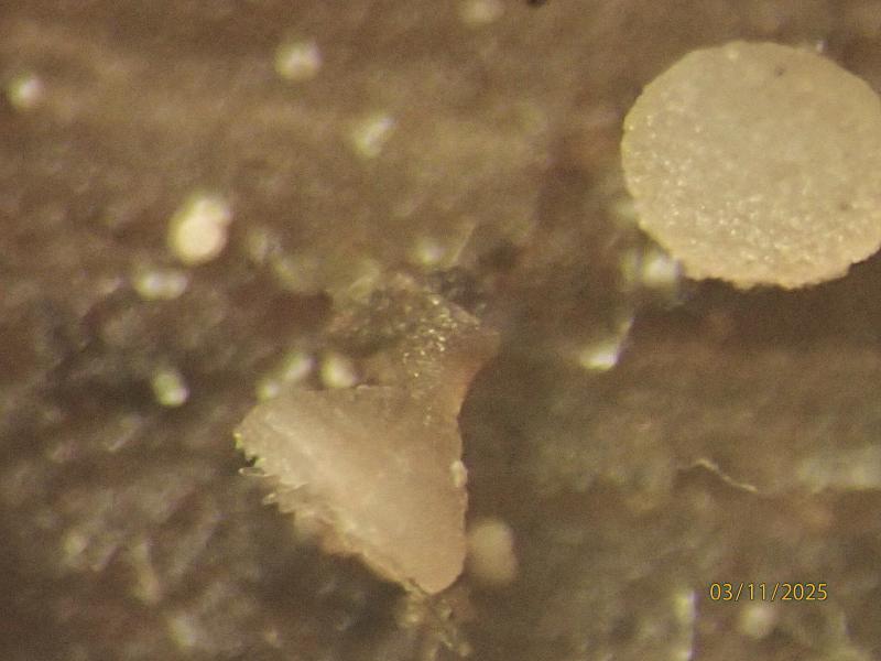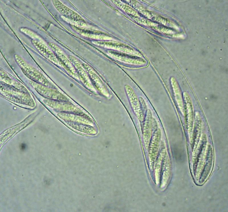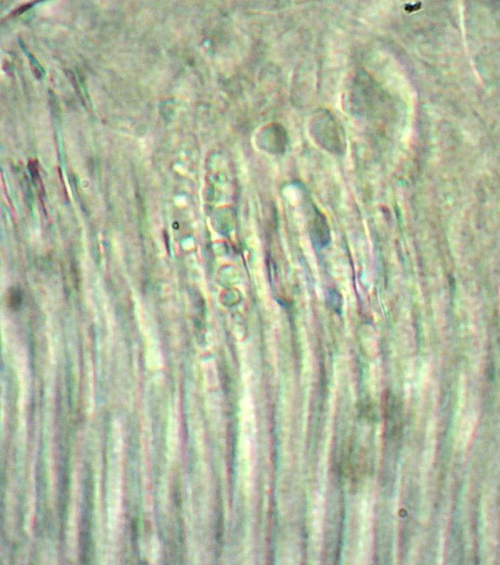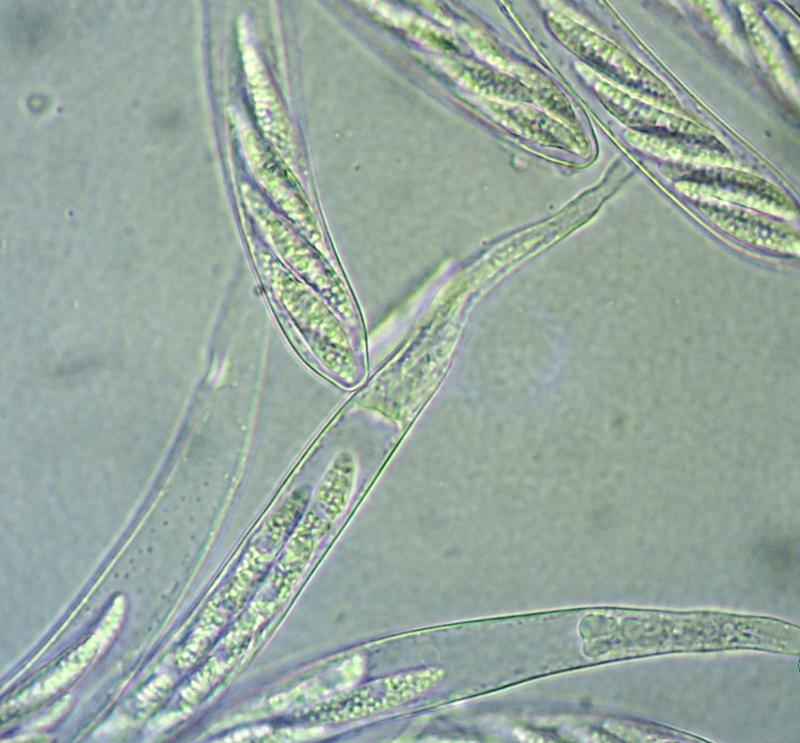 These tiny (0.4-0.5 mm diam.), whitish, short-stipitate apothecia were collected on decorticated log of Populus tremula (estimated to have died and fallen ca. ten years ago) in Oslo. The excipulum and stipes somewhat darker than the hymenium, the entire ascocarps turning brownish upon drying. Asci clearly protruding beyond a dense palisade of rather thick, cylindric, septate paraphyses with large, somewhat refractive bodies in the upper part. Spores ca. 20-25 x 5 micr., somewhat fusiform, aseptate, curved, multiguttulate, biseriate in the upper part of asci. Asci clavate with a long base, without croziers (?), IKI+ (blue ring in Lugol).Microscopically I think of Tatraea sp. Spores similar to T. macrospora, but that species does not occur in Europe (?). Also the apothecia are much smaller than any Tatraea I find in the literature. So I guess I am wrong. Any suggestions? Microscopy done on fresh material in water.