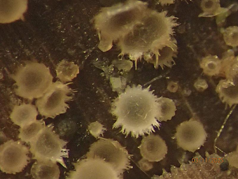 These tiny (0.4-0.5 mm diam.), whitish, short-stip