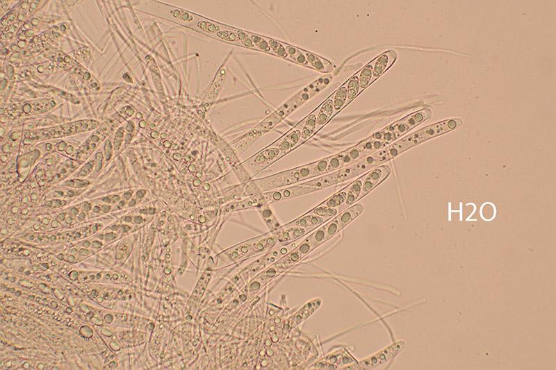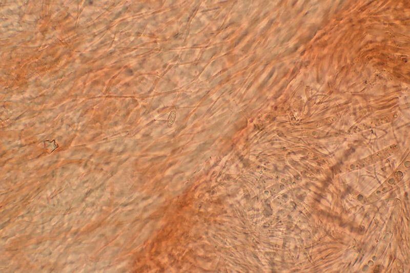 Yesterday I found a fungus on or near a needle, about 5 mm high. It is yellowish when fresh, later brownish with hairy and longitudinally whitish fibers. The spores are on average 16.2 x 6.1 microns. IKI+