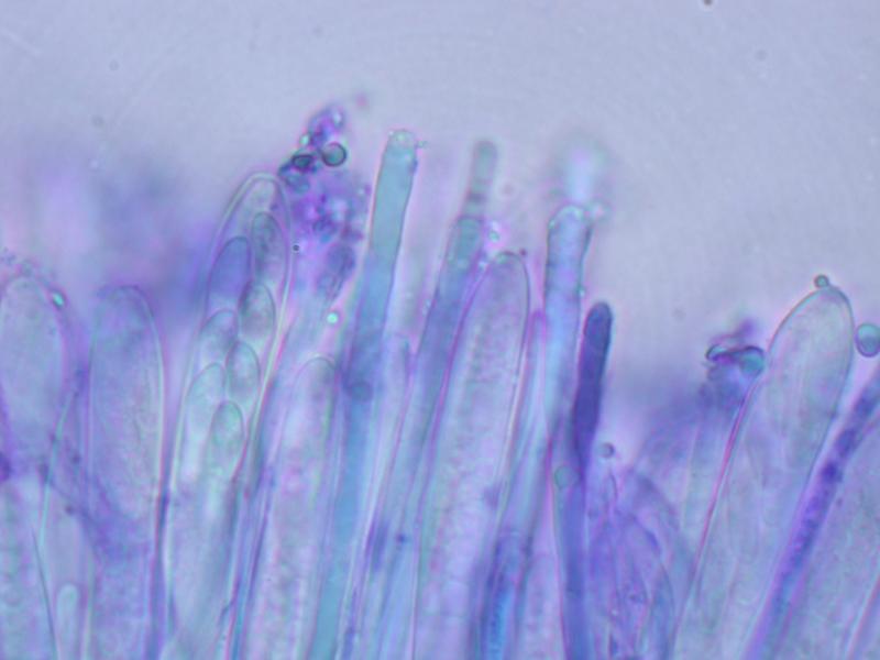 Paraphyses x3 -4 µm, avec bien sur une vacuole réfringente homogène mais souvent avec une guttule au sommet non réfringente .
