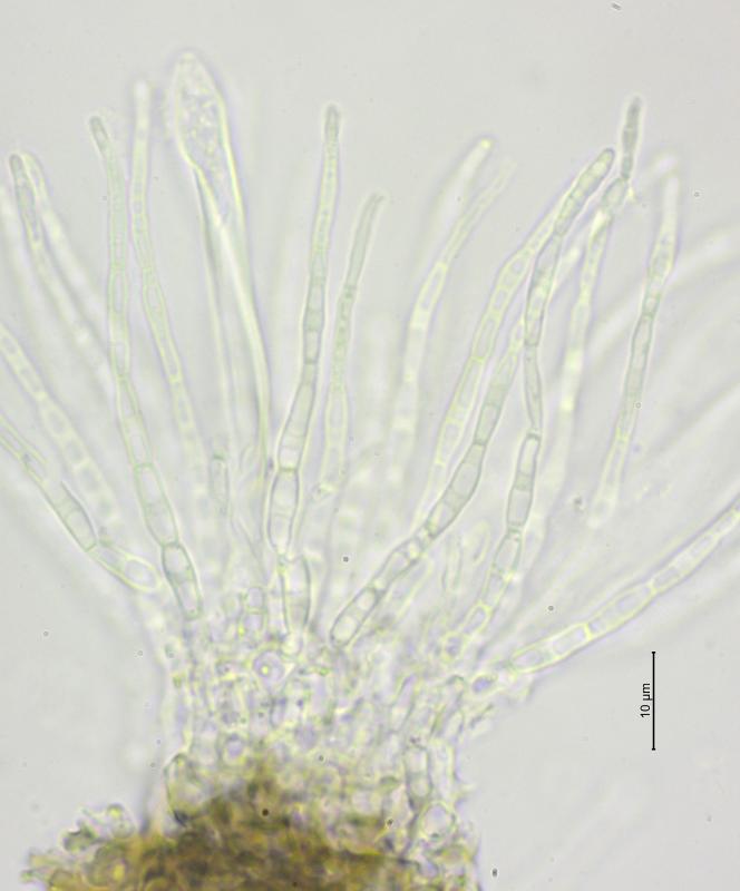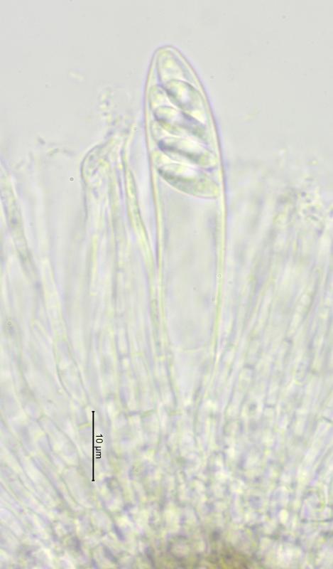 Trouvé sur tiges mortes de Rubus (ronce, pâturages boisés à 980 m), apothécies de 0, 4 – 1.25 mm de diamètre, asques 60–74 x 8–10,5 µm, avec crochets, IKI+, spores hyalines, 9,5 - 12 x 3,5–4,5 µm, paraphyses septées. Rien trouvé de correspondant, c'est pourquoi je sollicite votre aide. Merci d'avance.