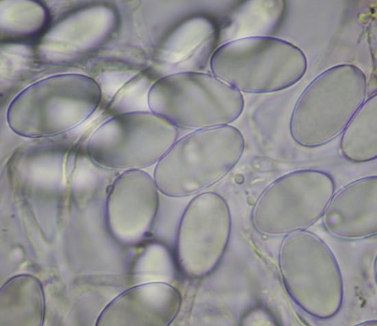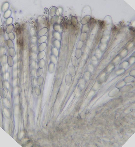 Apothecia 1.5-2.5 mm diam. with raised, entire, light purplish brown margin. Asci 8-spored. Spores ellipsoid, smooth, (15.9) 16-17.6 × (8.6) 9-10 (10.2) um. Paraphyses not inflated, often with thinner finger-like outgrowths on apex, frequently branched at the topmost septum, the top covered with some brownish pigment. Hairs covered with lumps of yellowish brown amorphous pigment.