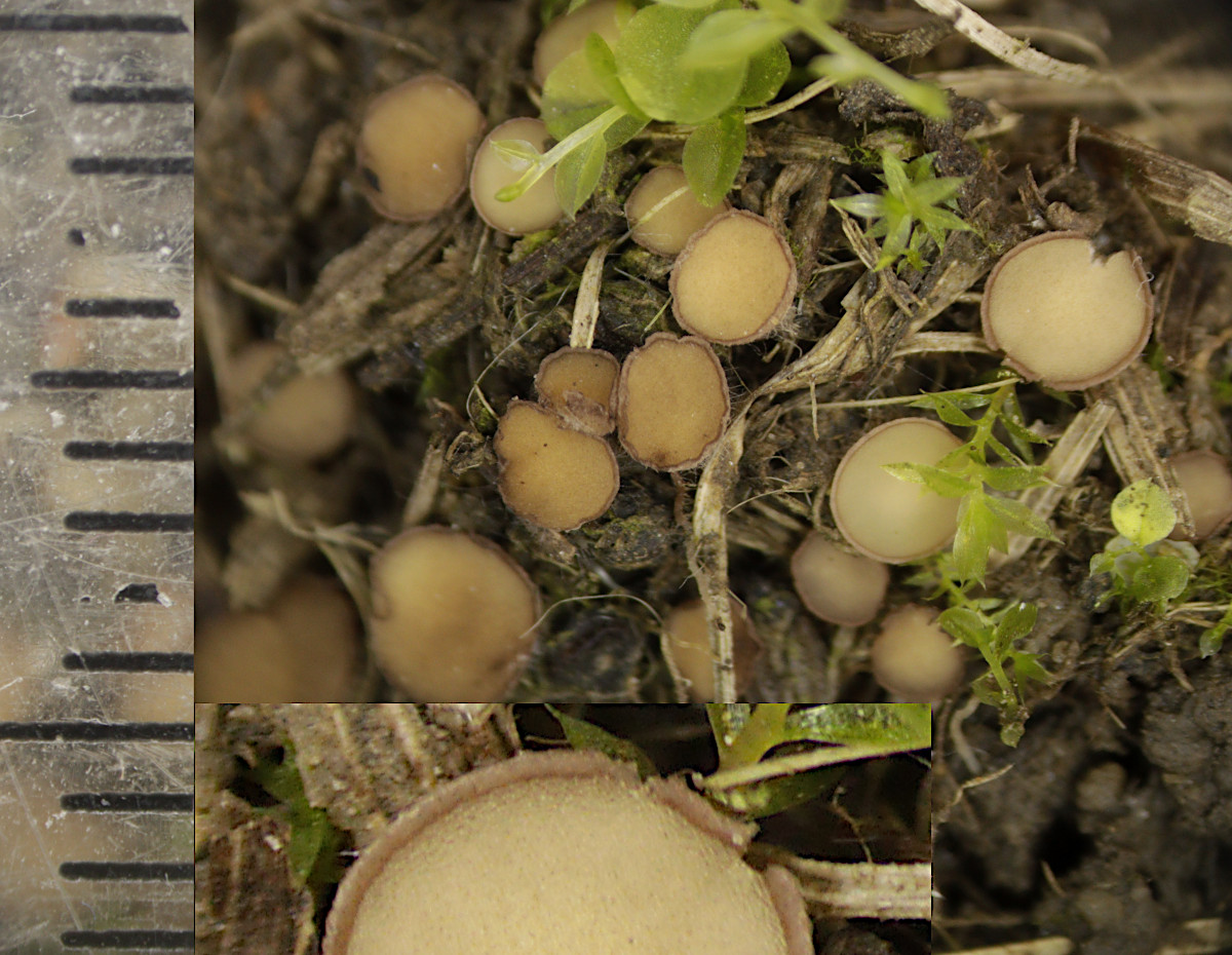 Microscopic characters look like P. cervaria, there is even a pale P. cervaria here: http://ascofrance.com/search_forum/22650 , but this grew on soil and has wider spores. The spores fit better P. subalpina, but that one also grows also on dung and has crenulate margin and reddish brown disc. Velenovsky's terrestric Humaria intermedia in orig. sense (which is a Pseudombrophila accord. to Svrcek) is also similar, but the species is only known from type collection. What do you think?