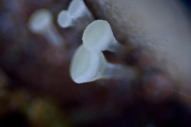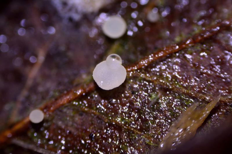Specimens growing on indeterminate leaves in a mixed forest of Quercus robur, Alnus sp., Populus sp., and other riparian vegetation.