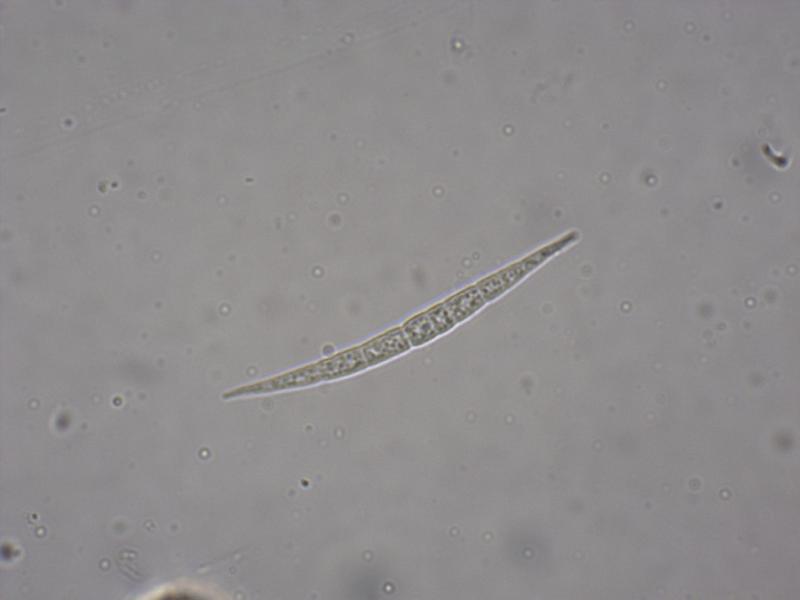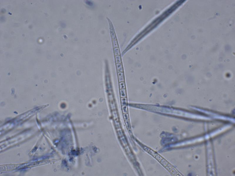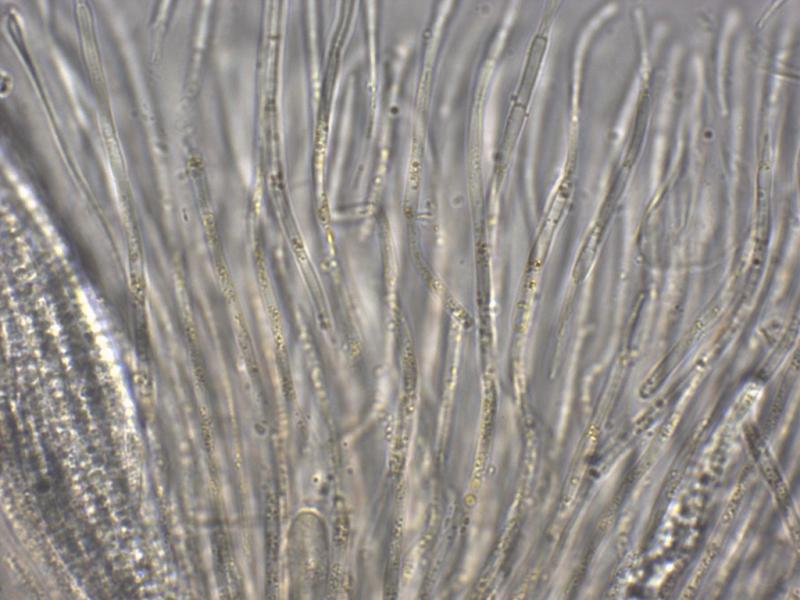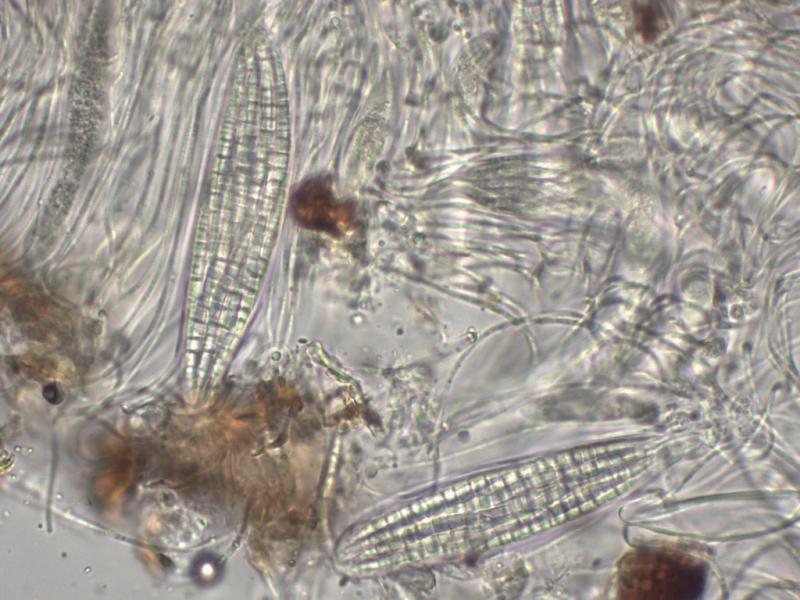 Apothécies de diamètre 0,5 mm environ, érompantes. Hyménium orangé, marge brune épaisse contrastant, rarement dentée. Excipulum à cellules à paroi épaisse, paraissant gélifiée, couche externe ambrée. Asques cylindracés à fusiformes, 68-100 x 18-28 µm, emplis par les spores parallèles, inertes dans IKI, mais la paroi des jeunes asques se colore en bleu dans KOH + IKI. Nombre de spores par asque difficile à évaluer. Paraphyses cylindriques, de diamètre jusqu'à 2 µm, tortueuses, septées, contenant des petites gouttes jaune orangé. Spores longuement fusiformes avec les 2 extrémités acuminées, contenant de nombreuses petites guttules, septées (7 à 14 cloisons, le plus souvent 13), (33)55-82 x 3-4 µm, avec une très légère constriction au niveau des cloisons, plus marquée sur la cloison centrale. On voit parfois des spores brisées en 2 au niveau de la cloison centrale.