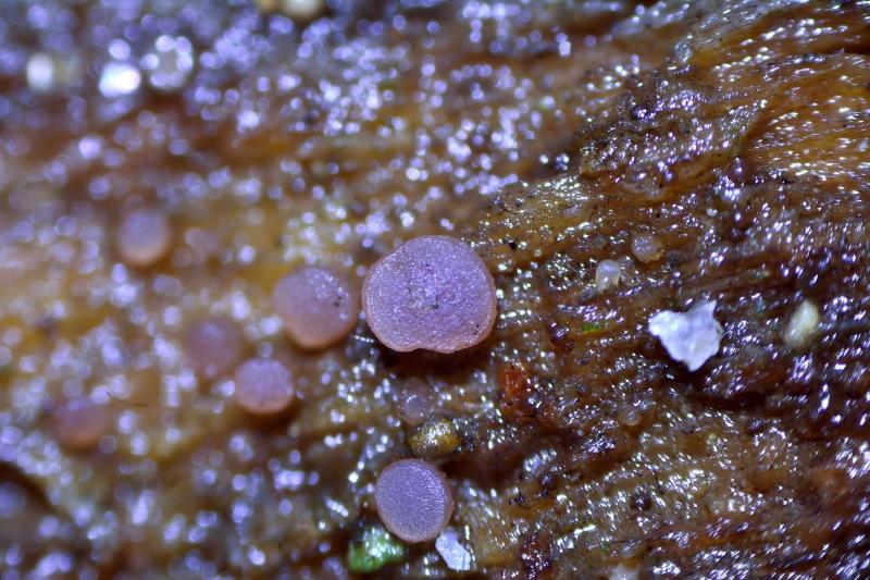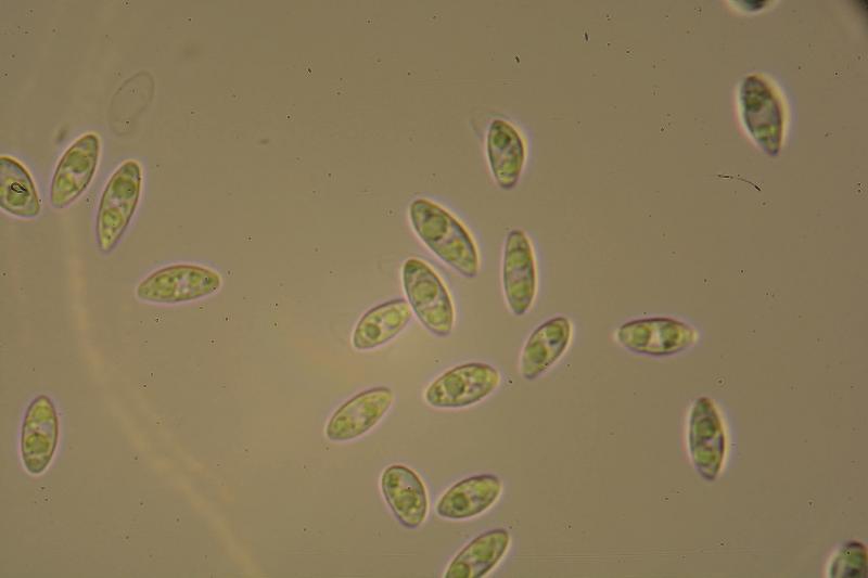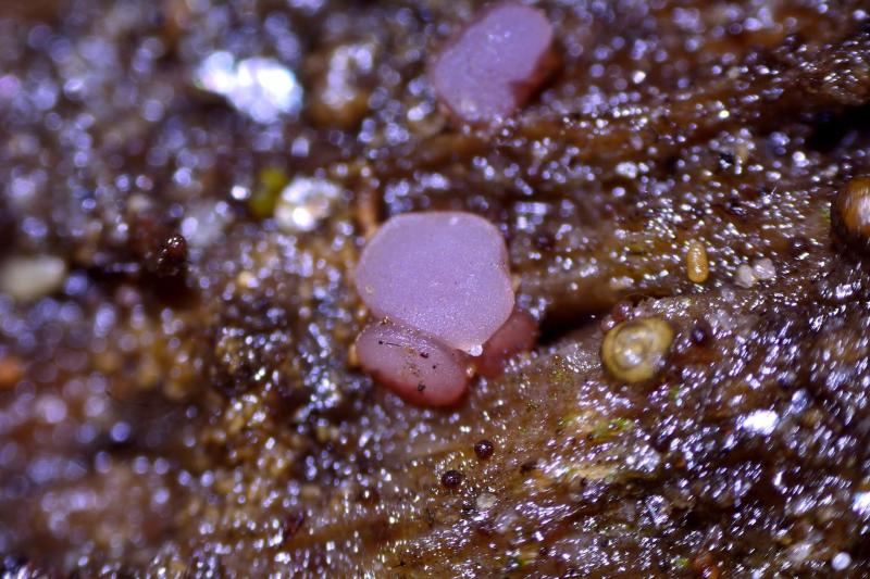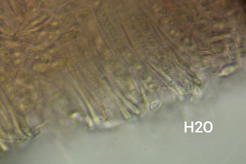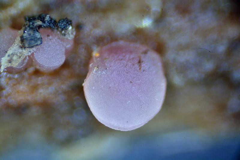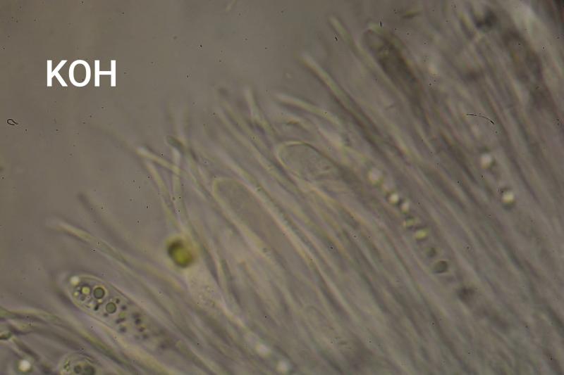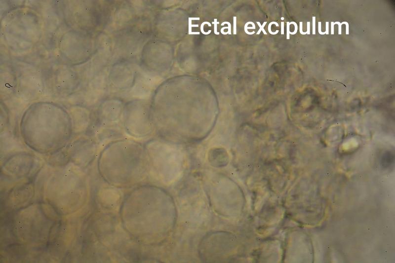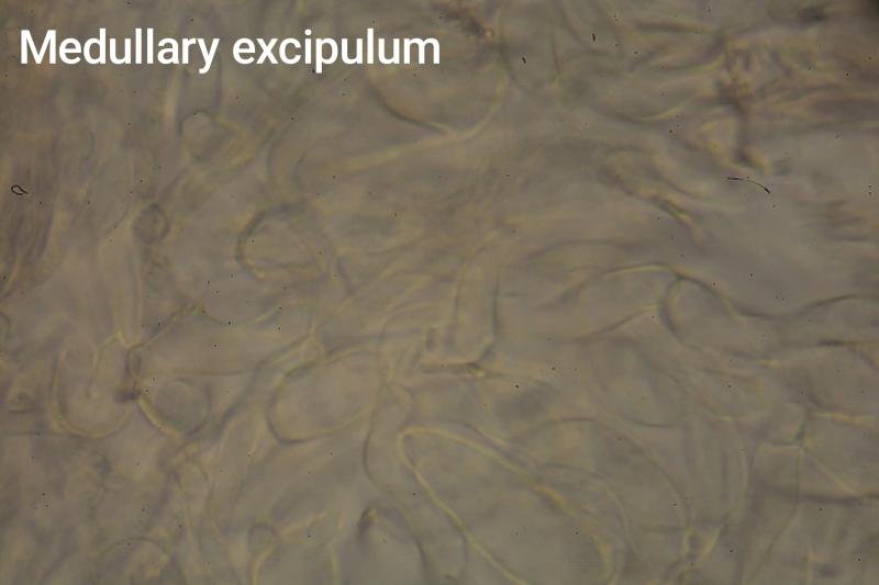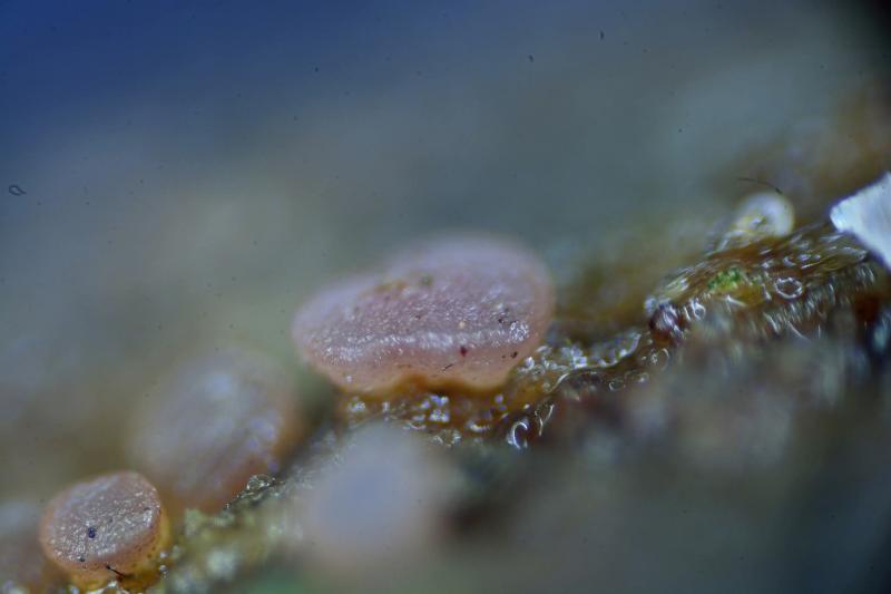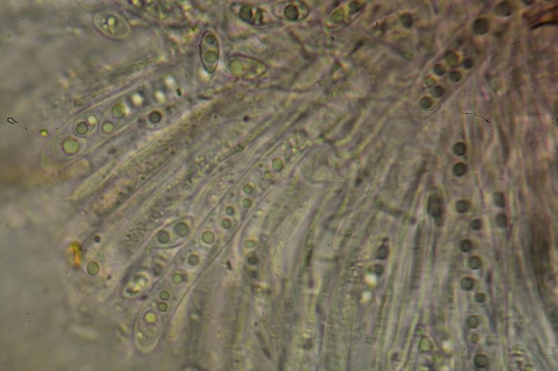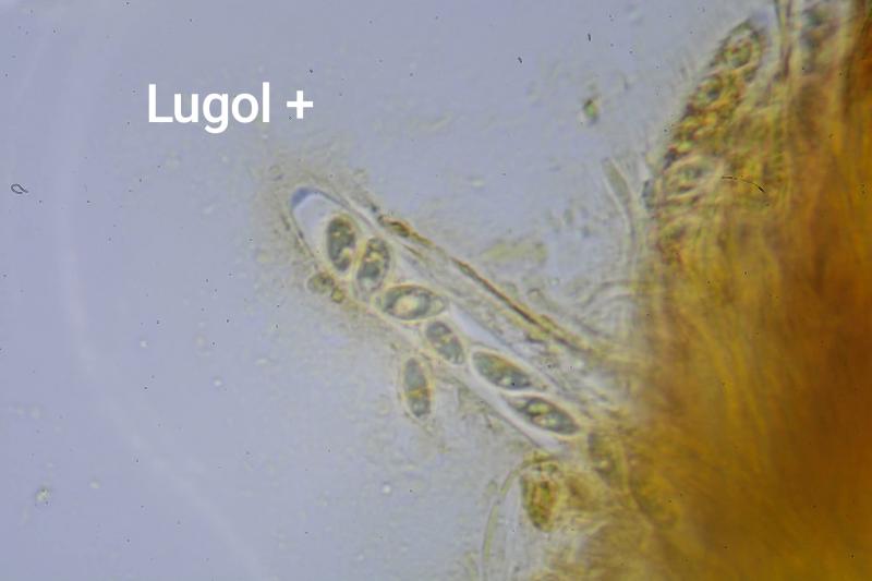 Specimens less than 1 mm in diameter. Growing on unknown wood (possibly Cytisus sp.) on a slope with low scrub. Positive reaction of the ascus apex in Lugol's iodine. Spores measured in water: