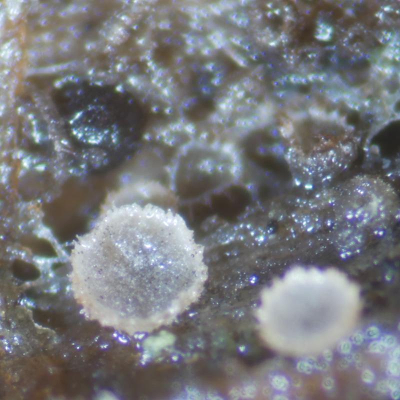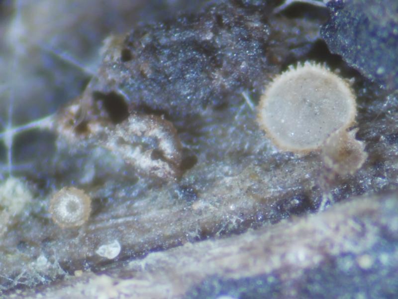 Discus up to 0.25mm, sessile, on the edge somewhat coronat hairy. Excipulum hairy. Hairs multicelled, the outer cells with dark grains on the surface.