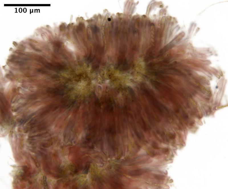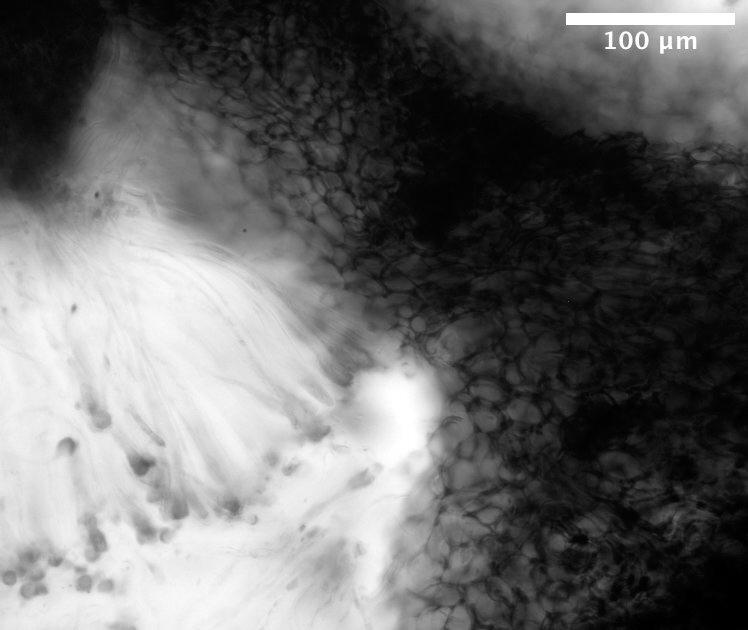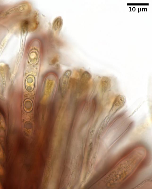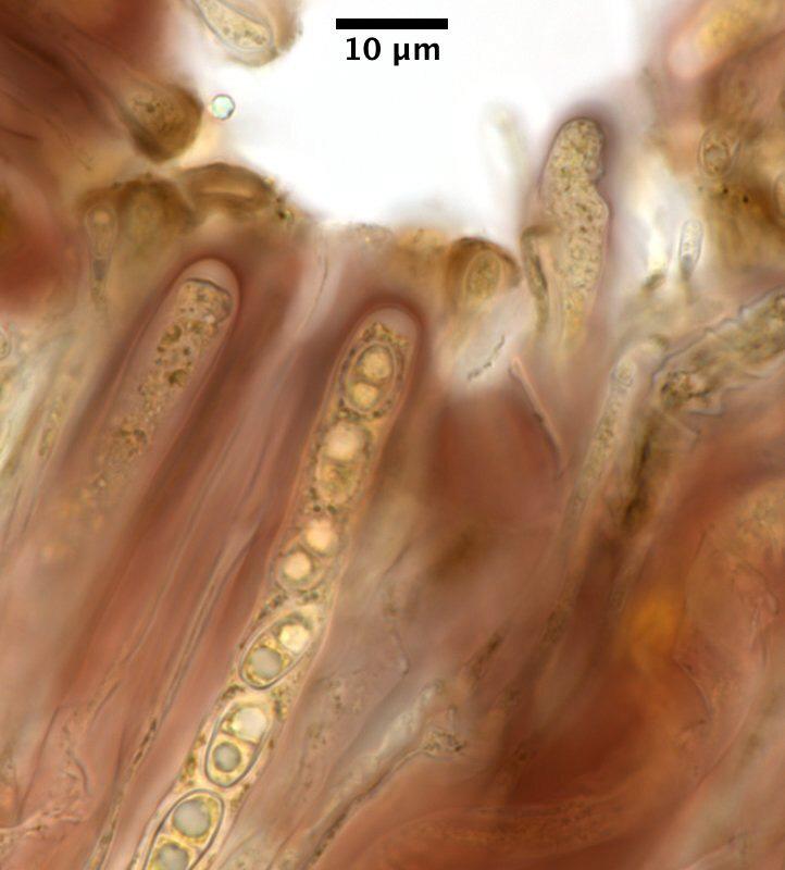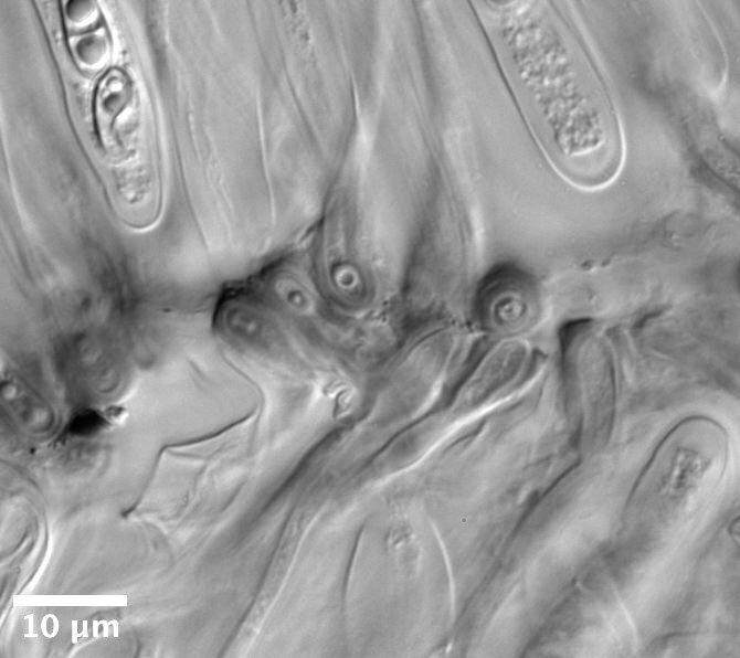 "The hymenium was embedded in an extracellular gel with odd iodine staining, sometimes maroon (high iodine) sometimes teal (low iodine) suggesting a strange mix of amyloid/dextrinoid, with some carotenoids thrown in. Paraphyses swollen tips included a weird doughnut shaped structure, in fresh specimens at least. Paraphyses tips were also highly absorbent in blue light, and even more so in UV light (using a monochrome camera and UV light source)"