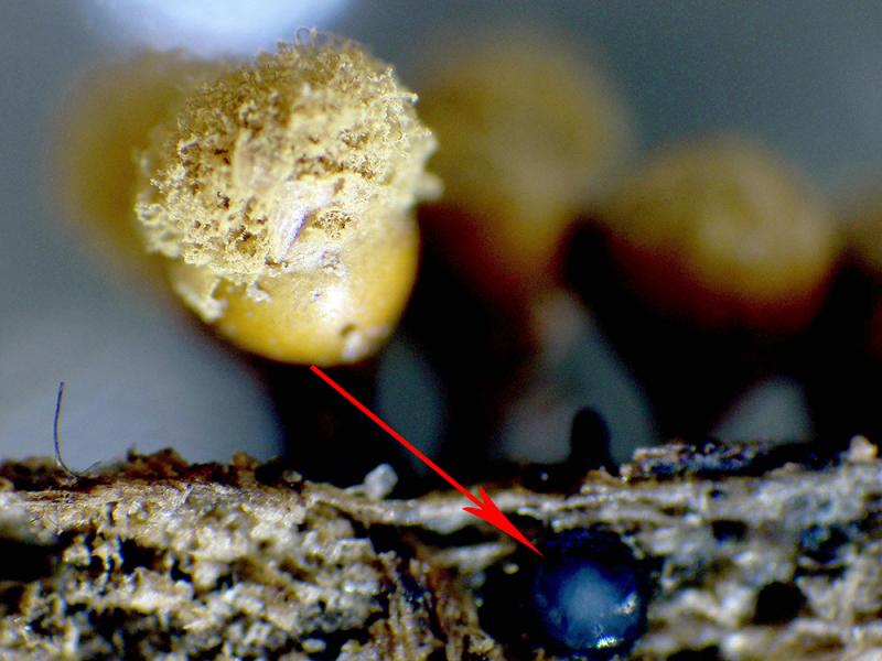 A tiny ascomycete found embedded in wood in a very advanced state of decomposition, appearing beneath some specimens of Hemitrichia clavata.
