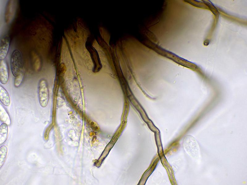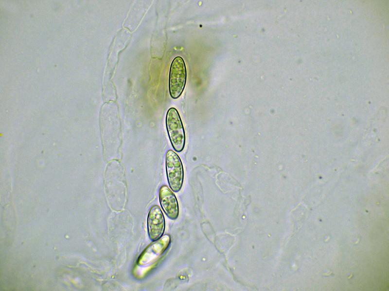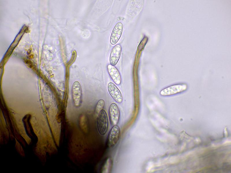Octosporous asci with a small apical apparatus resembling two dots. Paraphyses very scarce to practically absent; the few observed are filiform and septate.