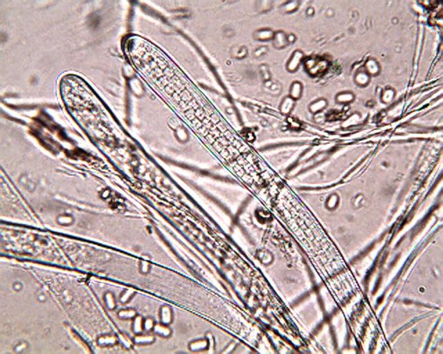 Esporas al principio enteras dentro del asca, despues fragmentadas dentro del asca para ser expulsadas.