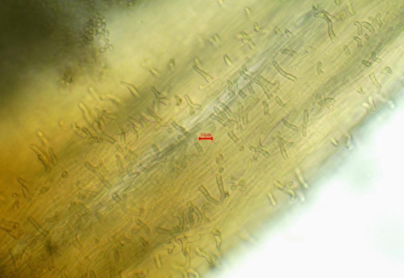 Une anamorphe rose stipitée, très nombreux synnema, stipe surmonté d'une tête globuleuse, stipe velu brun rouge plus foncé en bas, avec excroissances simples hyalines cylindriques à sinueuses, obtuses, à paroi épaisse parfois uniseptées, plus nombreuses vers la base, qqs unes plus longues branchues et septées (1-3 cloisons) à l'extrême base, le stipe de textura porrecta, hyphes colorés vers l'ext et incolores à l'int., hyphes stériles du stipe septés semblent pénétrer à l'intérieur du capitulum, capitulum conidiogène, conidiophore verticillé, conidies hyalines ou peu colorées, rose en masse, à paroi épaisse, ellipsoïdes lisses, 5-6x2.5-3.5µ, se formant à l'extrémité des branches du conidiophore, sur tronc mort debout de feuillu (frêne ?), en boisement riverain de Chalosse (40)