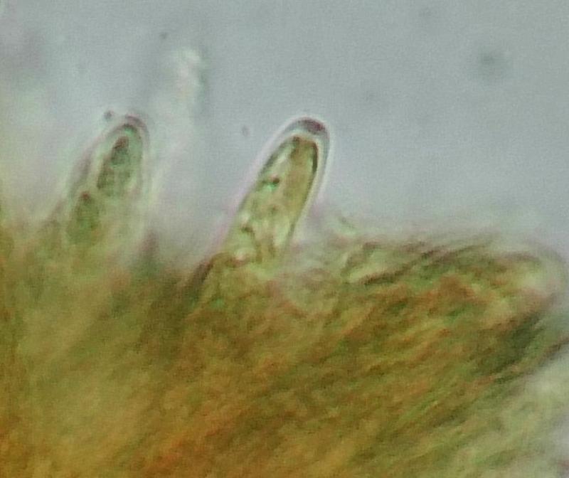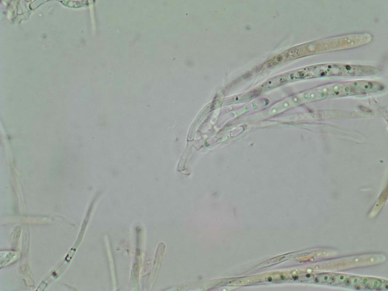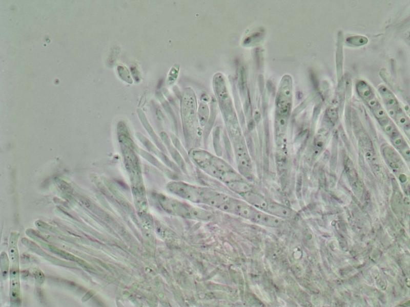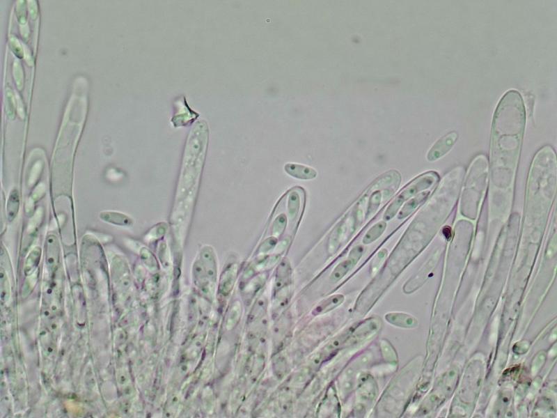 Apothécie blanches, pseudostiîtées, IKI RR, H-, excipulum ectel à textura globulosa, spores ellipsoïdes, hyalines, biguttulées, OCI -2, 6,5-8,1 X 2,4-2,9µ Q : 2,4-3,0