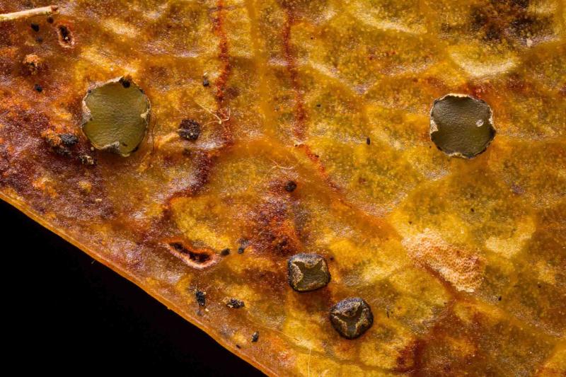 Coccomyces sp. on fallen Rhododendron leavesPretty Hollow Gap Trail, Great Smoky Mountains National Park, Haywood County, North Carolina, USA