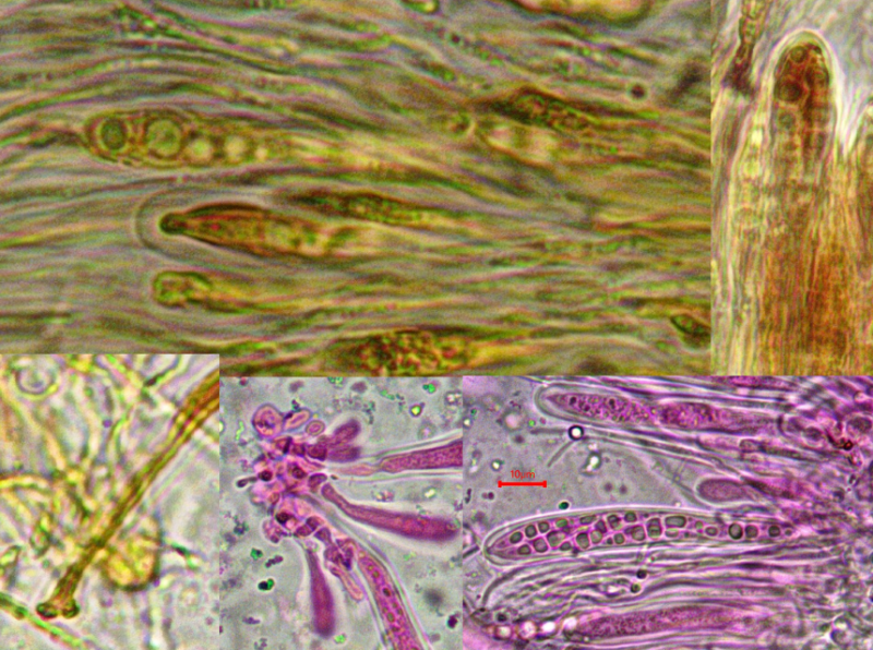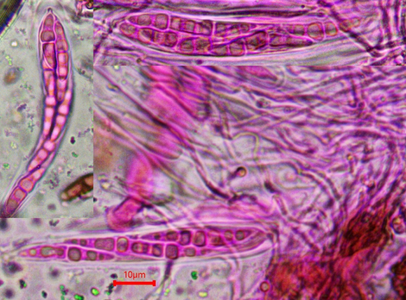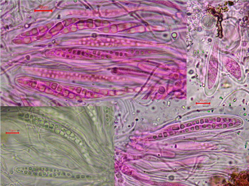this one is especially interesting for me because it is the host of an Unguiculariopsis that I plan to show here soon. First, I would like to know more about hte host. Growing on Quercus (Germany, Baaria), attached twigs at lying middle-aged log. The stromata contain some perithecia with white content (hyaline spores at least for long time). The asci are iodine-negative and bear croziers. There are plenty periphyses. The spores are for a long time hyaline, with the second cell distinctly enlarged, and measurea about 19-23/4-5,5 µm. The pink color in the fotos is from phloxine (mixed with water).