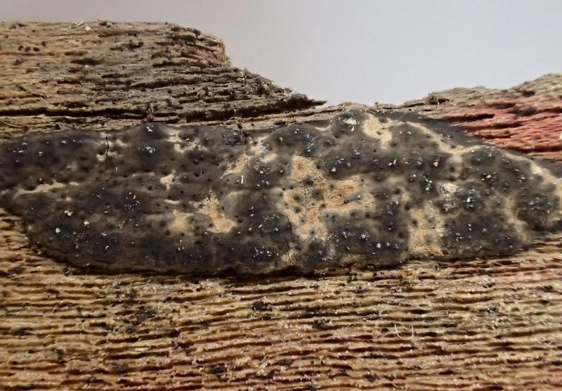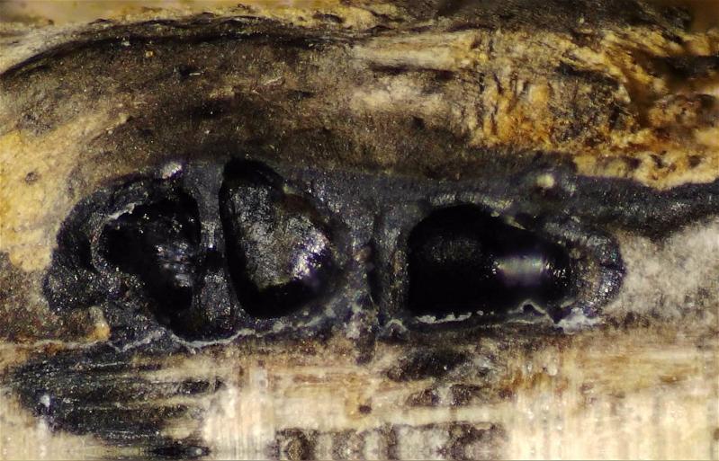 The ostioles are papillate and black. The black carbonaceous layer surrounds the perithecia, covers the stroma, and extends into the xylem beneath the stroma.