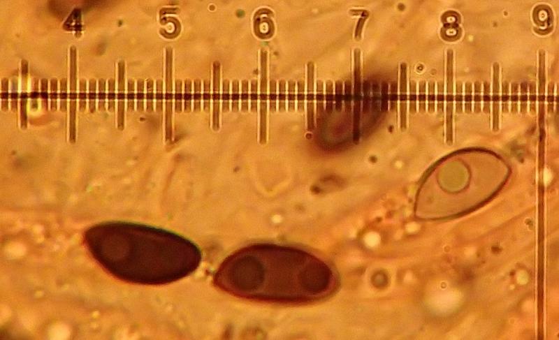 The spores are dark brown to blackish with a straight germ slit running from end to end. They often have one rounded tip while the other is pinched.