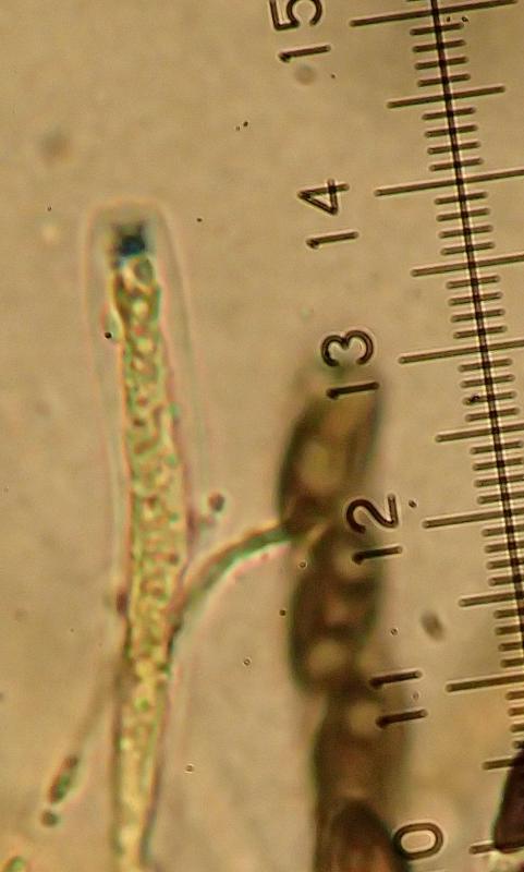 Cylindrical IKI+ asci measure 120–130 x 6–8 µm. The apical ring generally appears to be as tall as it is wide: H x W = 1.5–1.6 x 1.6 µm. The spores are uniseriate.