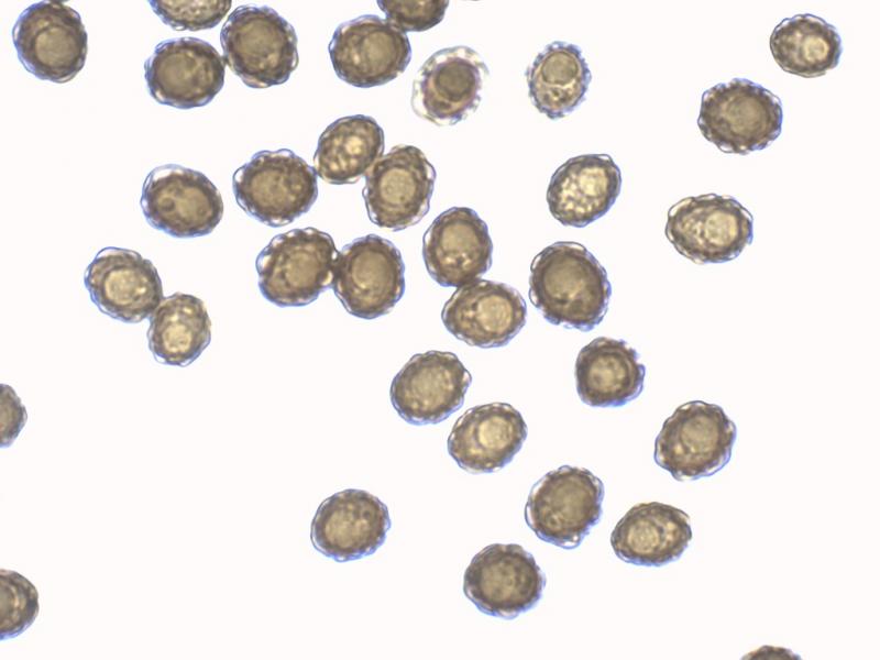 Cléistothèces superficiels, peu nombreux, de diamètre 250-330 µm, à surface finement verruqueuse, jaune orangé, avec à maturité une masse sombre (spores) visible par transparence. Péridium verruqueux à cellules polygonales jaunâtres de longueur jusqu'à 18 µm. Asques peu visibles, évanescents, subglobuleux de diamètre 17-20 µm, contenant 3 (4 ?) spores. Spores largement elliptiques à subglobuleuses, vert olive, 10-12 x 8-9,5 µm, contenant une grosse goutte de diamètre environ 5 µm, à surface bosselée tuberculeuse, et paraissant perforées de petites cavités, avec au moins un pore germinatif.