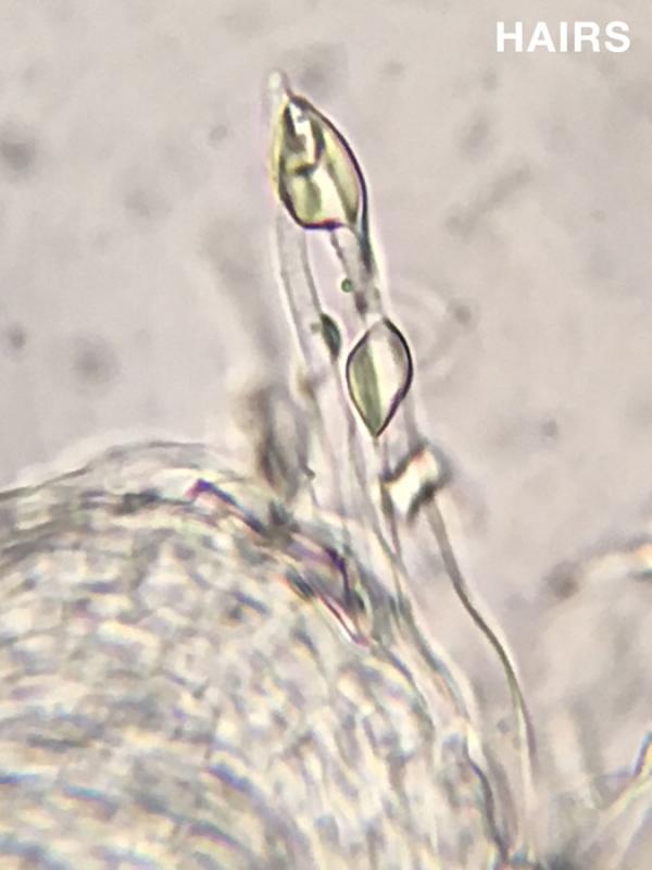 Hairs inflated at the base, tapering at the apex, some with yellow exudate.