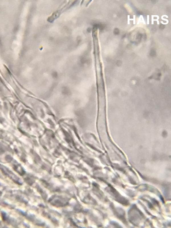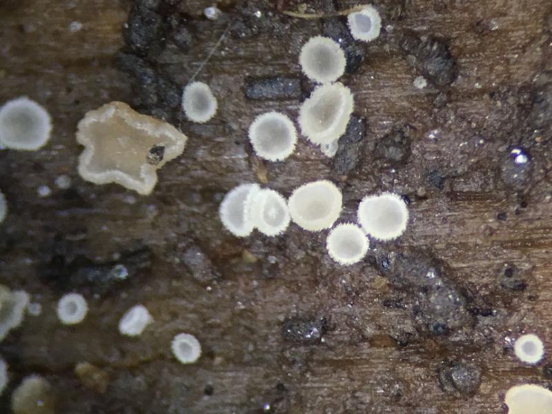 Apothecia white with marginal hairs. Apothecia discoloring slightly orange in age. The largest apothecia are about 0.6mm in diameter.