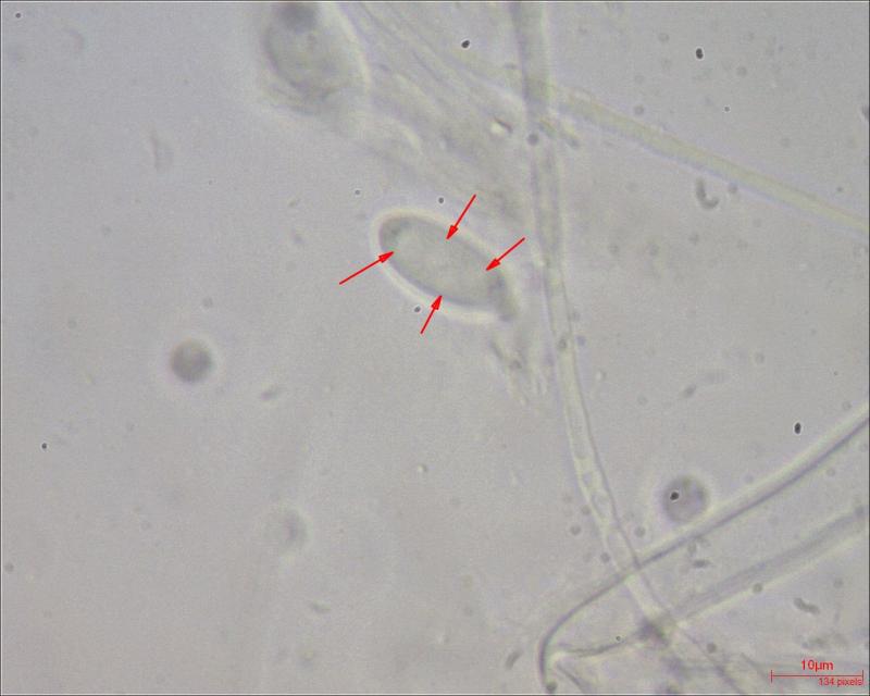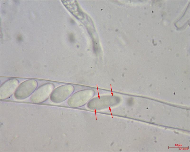 - measurement 2 (in spore in water): (12.9) 14.1 - 16.6 (17.2) × (6.1) 6.3 - 7.5 (8.6) µm