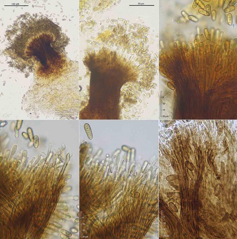 I would appreciate any assistance regarding these tiny, dark synnemata up to 200 microns high growing in clusters on semi-rotten hardwood at 1000 m of altitude The conidiophores are dark, fasciculate, that generate non-septate, unchained, olivaceous-brown acroconidia.