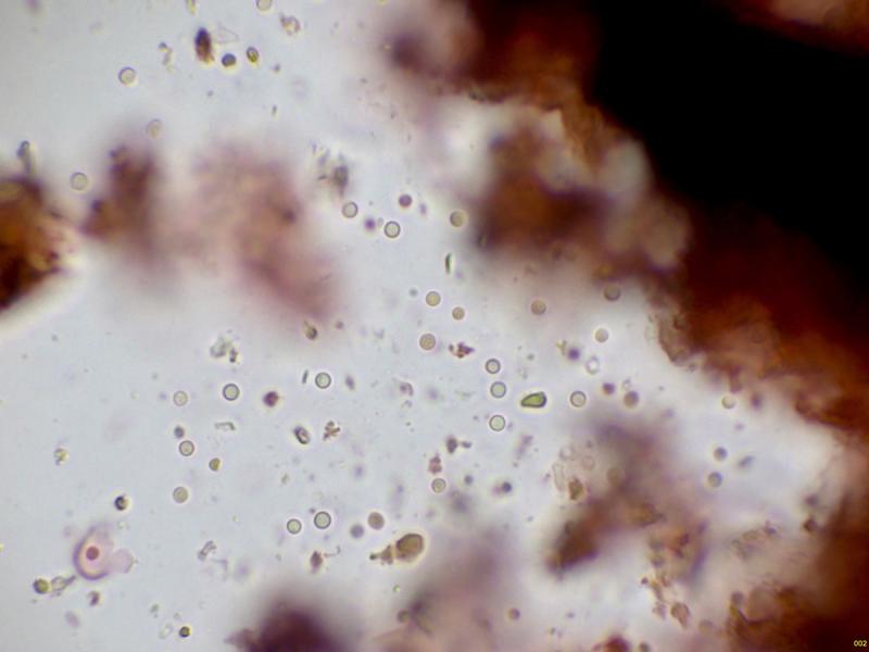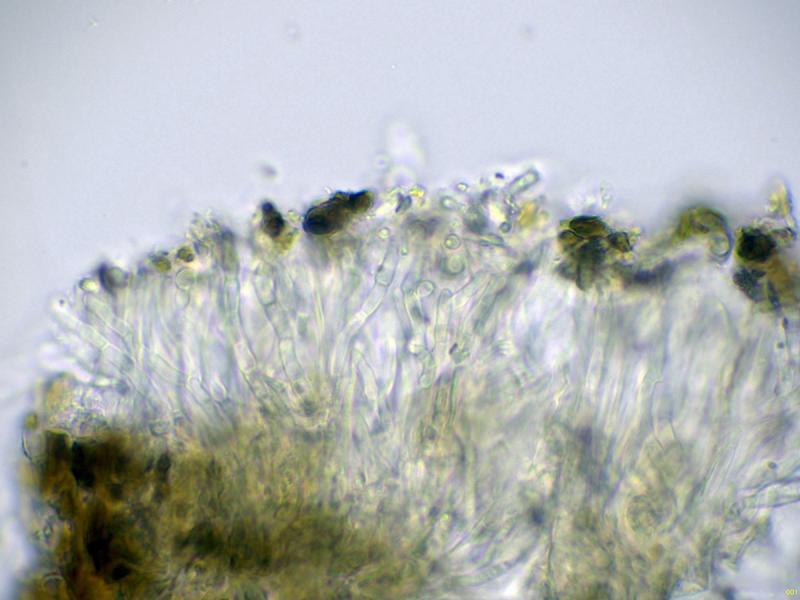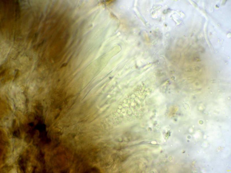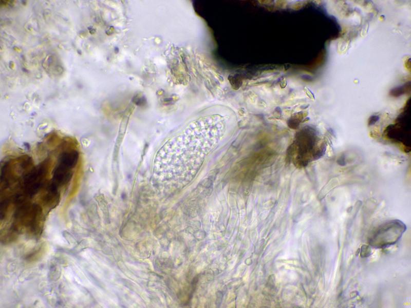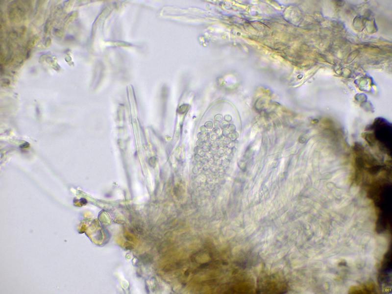 Scattered asci with multiple spores inside, apparently more than 100 ascospores per ascus; these asci show no reaction to Melzer's reagent. Filiform, septate paraphyses with pigmented amorphous material on their surface, which do not protrude above the level of the asci.