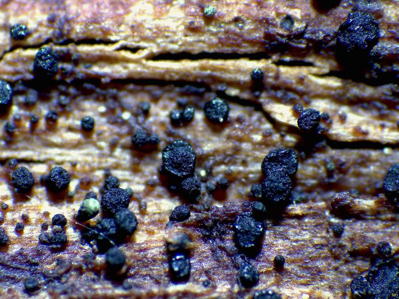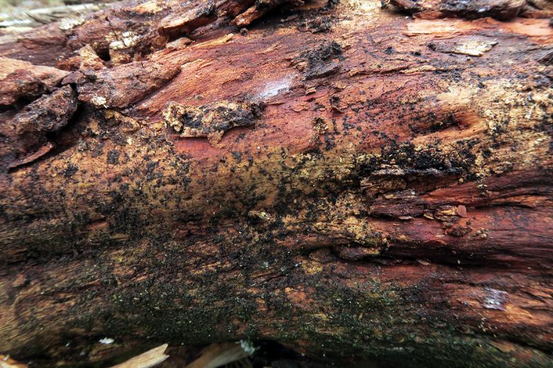 A very tiny pyrenomycete sprouting sparsely but abundantly on the surface of a debarked, fallen pine log, appearing on the side in contact with the ground.