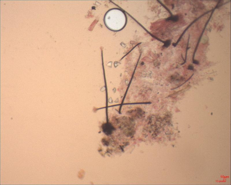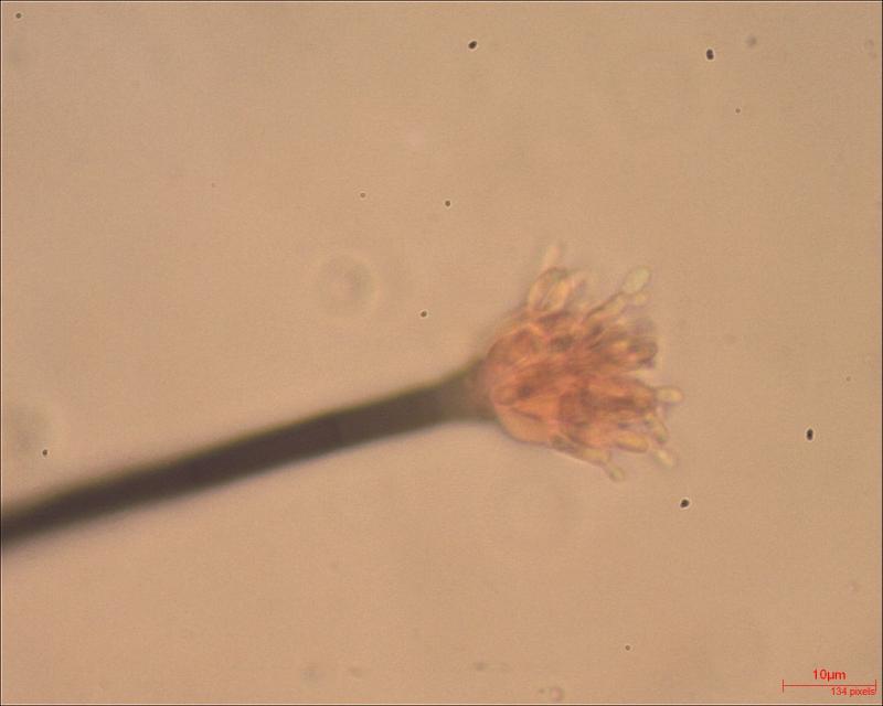 Apothécie blanches, pseudostiîtées, IKI RR, H-, excipulum ectel à textura globulosa, spores ellipsoïdes, hyalines, biguttulées, OCI -2, 6,5-8,1 X 2,4-2,9µ Q : 2,4-3,0