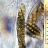 here I have a second indeterminate pyreno which grew on the bark of a living Fraxinus. The ascomata are very conspicuous because they can be from Navicella-like with a small, slit-shaped neck to even Ceratostomella-like with a long and thin neck (I checked that they really are of the same species). The spores are 22,5-25 x 8-9 µm, mature always 4-celled and slightly rough, often with two paler end-cells. The asci are bitunicate and 8-spored. I didn't find a species within the Lophiostomataceae which would fit with my species.