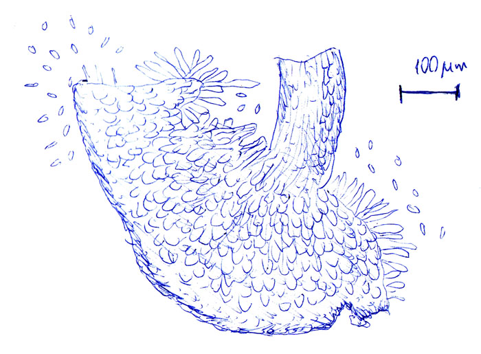 La description que ces auteurs en font, ainsi que celle dans Saccardo qui reprennent celle de l'auteur Fuckel (si j'ai bien tout suivi) ne donne pas les dimensions des spores filiformes. Ceci étant, je pense bien qu'il s'agit de cette espèce.
