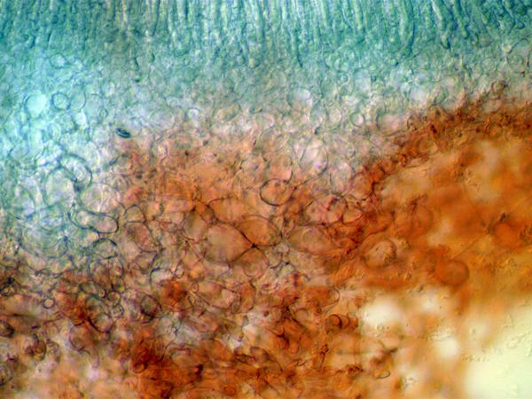 P. ampliata possède un excipulum entièrement de t. globulosa. Sur tes photos, il me semble distinguer des hyphes au milieu des cellules arrondies, donc j'écarterai cette espèce.