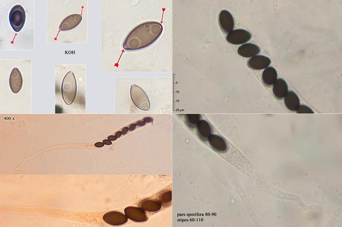 | Remarque | On horse dung incubated in humid chamber. Each spore containing a distinct basal germ pore and a much smaller apical pore (visible only after bleaching)marked with red arrows. Asci cylindrical/subclavate, long-stipitate, with no conspicuous apical apparatus |