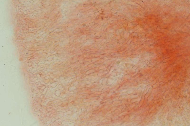 Excipulum from textura prismatica (oblita?), with dextrinoid reaction in MLZ (KOH), cells at the base larger , more ellipsoid (20 x 10), narrower to the edge, end cells obtuse, cohered (15 x 5); receptacle attaches to the substrate by the bunch the hyphae from cylindrical cells (15 x 5); asci clavate, with pronounced clamp, with CR+ content, with amyloid pore, 85 (78-93) x 10,5 (9,2-11); spores fusoid, with obtuse ends, with amorphous oil content in fresh apothecia, with several medium and small guttules in KOH, mature spores 1-2 septate, septum thin, scarsely seen, content CR+, 15,3 (13,7-17,2) x 5,3 (4,8-5,8) (Q=,9; N=16, spores from alive apth.); paraphyses cylindrical, slightly bulged in different parts, segmented, branched in 2-4 parts or unbranched, 1,5-3 mk broad.