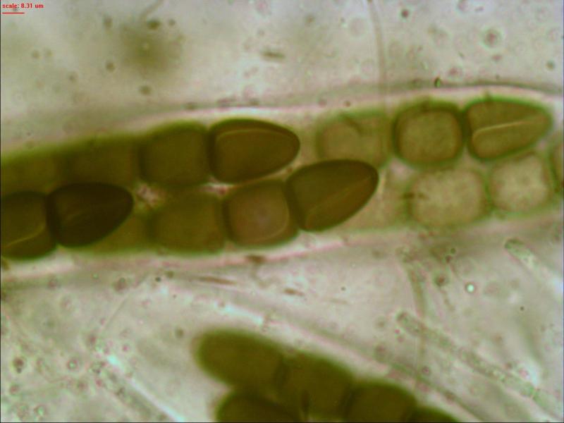 Spores: 4-celled 47.43-46.64x9.19-10.69 um; bi or tri-seriate above and uni or bi-seriate below; septa transverse; constrictions at septa broad and deep; broad gelatinous sheath; germ slit nearly oblique to diagonal.