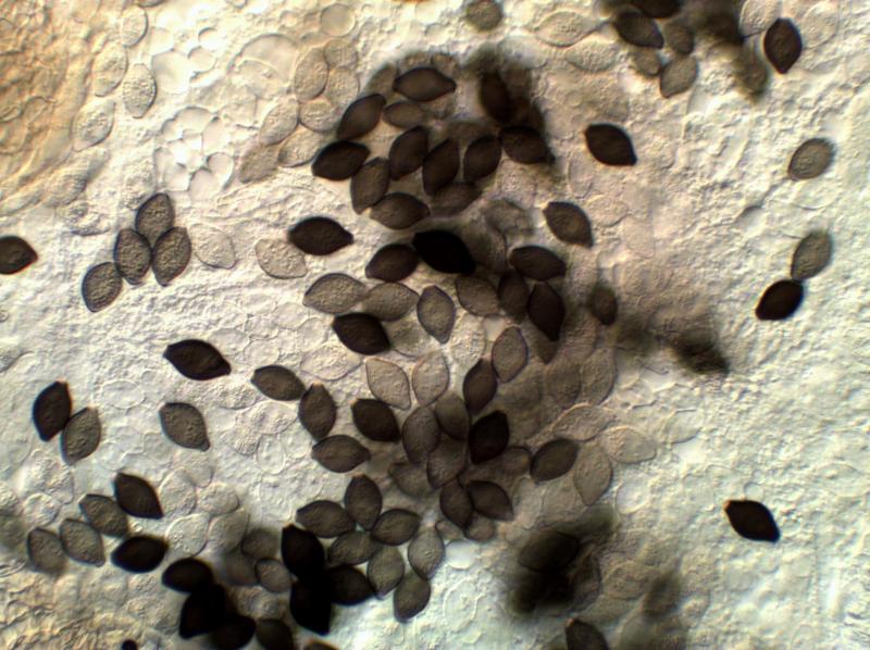 The perithecia were around 350µm diameter and did not have a neck, but there was a darkened area around the ostiole, associated with some hyaline hyphae (see image). I did not see any asci, so don't know whether they were 4- or 8-spored. The ascospores were limoniform, with, I think, 2 ostioles, one of them more obvious than the other. They measured 18.1-20.1 x 9.8-12µm, and were very finely ornamented with low warts - see photo - this shows the surface, not internal contents. I doubt I would have observed this subtle feature were it not for DIC illumination.